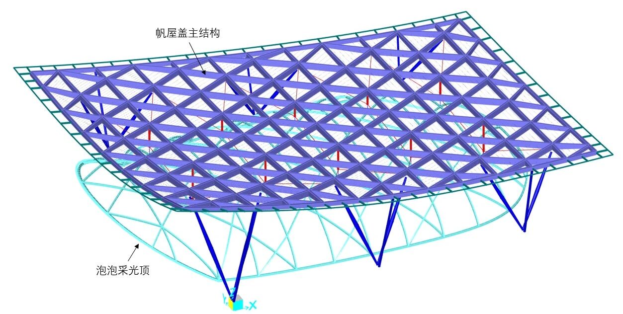 项目团队创新性采用“上刚下柔”式双层结构。上层帆形屋盖,为索撑张弦体系,屋面为空间双曲形态,最大边长约77米,最高点距地约27米,围护采用ETFE张拉膜;下层泡泡采光顶为单层网壳体系,最大平面尺寸长约70米、宽约41米,同时为满足建筑效果要求,保证泡泡网壳杆件截面尽量小,项目围护选用ETFE气枕膜结构。